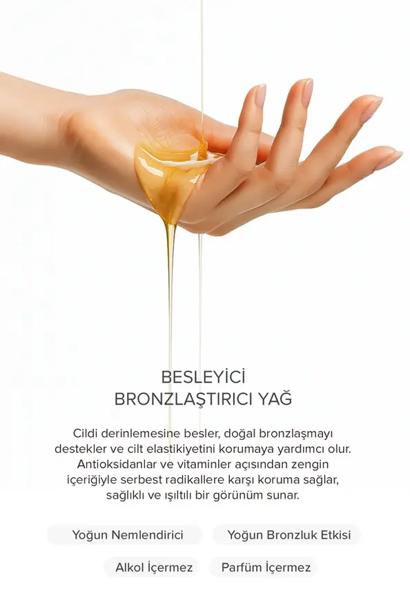 Kakao yağı, shea yağı ve doğal renk vericilerle zenginleştirilmiş bronzlaştırıcı yağdır. Ciltte çikolata etkisiyle sıcak bir ton bırakır, hoş kokusuve yumuşak dokusuyla cilde ipeksi bir hiskazandırır.
